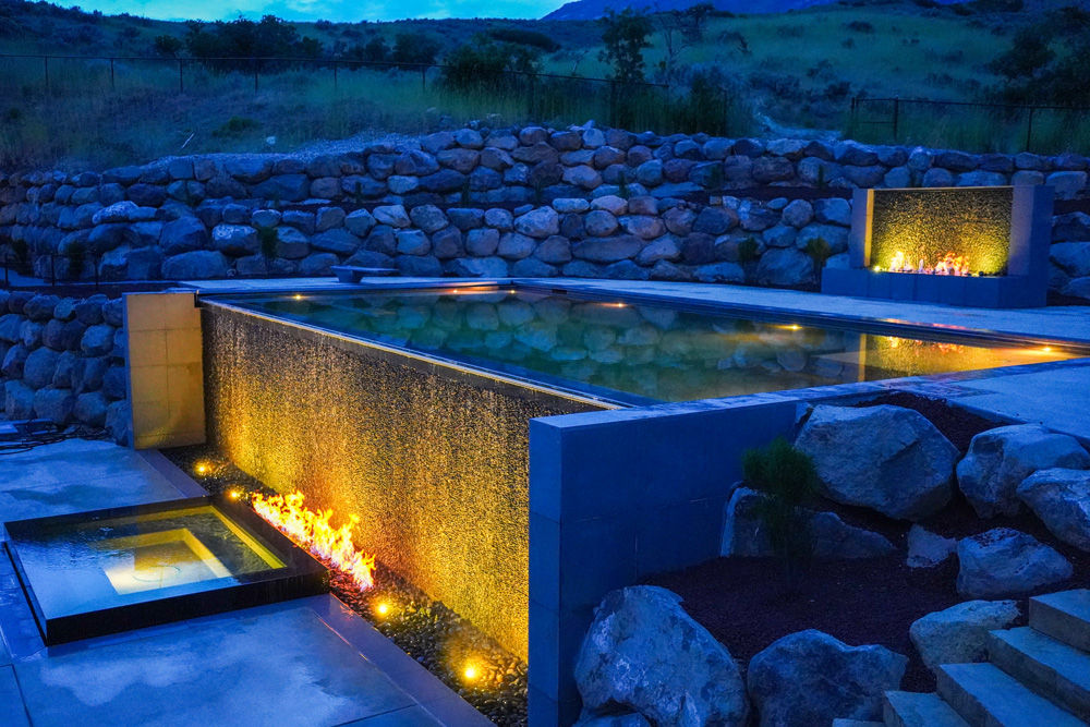 The Point of the Mountain project is a striking fusion of modern design and high-end functionality. The geometric pool layout is centered around clean lines and symmetry, creating a structured yet inviting environment. A raised spa seamlessly integrates into the design, with cascading water spillovers enhancing the sensory experience.